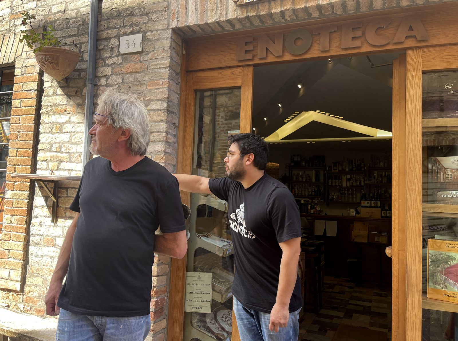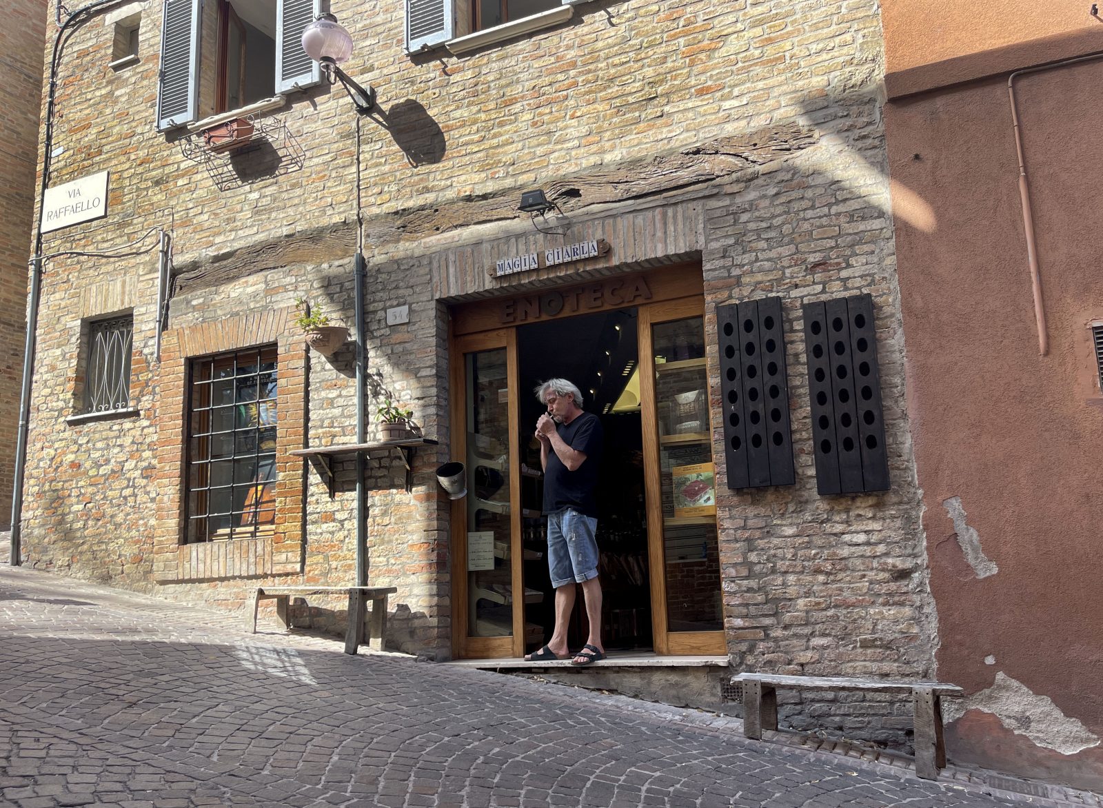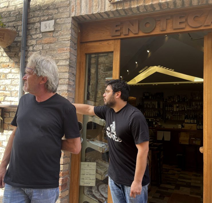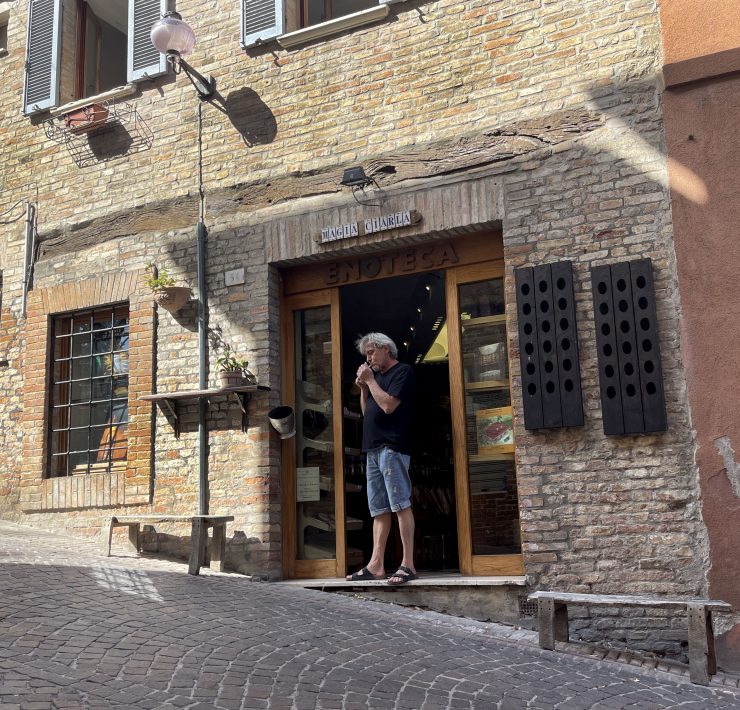 The community on the top of this street, which includes a bakery and a frame shop in addition to Rusciadelli’s wine bar, thrives with personality and welcomes both tourists and citizens of Urbino. “All of our shops work together and support one another,” Rusciadelli says. Giorgio Duranti, owner of the frame shop a few doors away, strolls in to have a glass of wine and a smoke. Says Rusciadelli, “This is the proof!”