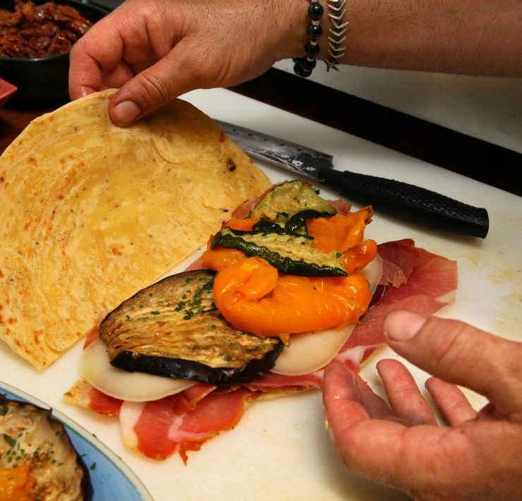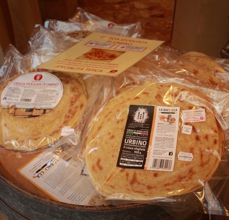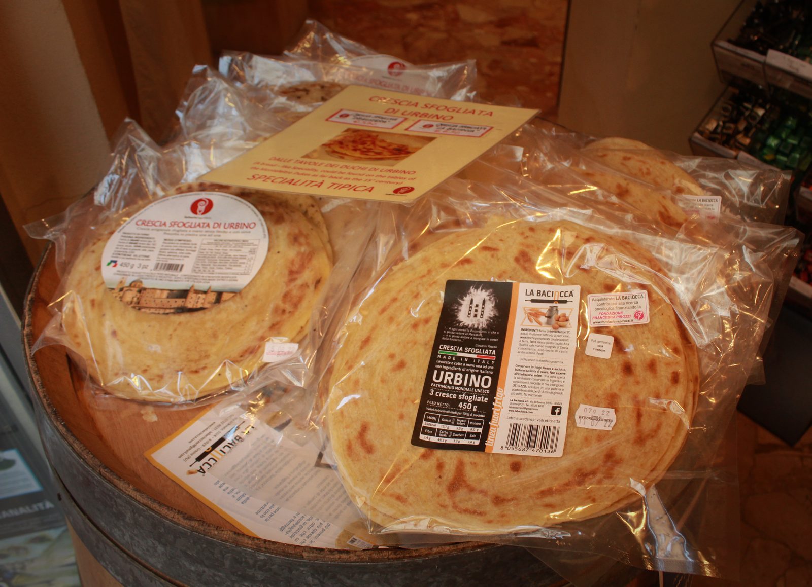 Il Ghiottone, a pizza and sandwich restaurant located just off Urbino’s main piazza serves La Baciocca crescia for its sandwiches. There are many options, including Squacquerone e Rucola (with cream cheese and arugula) and Crescia col Prosciutto (with dry-cured or cooked ham).