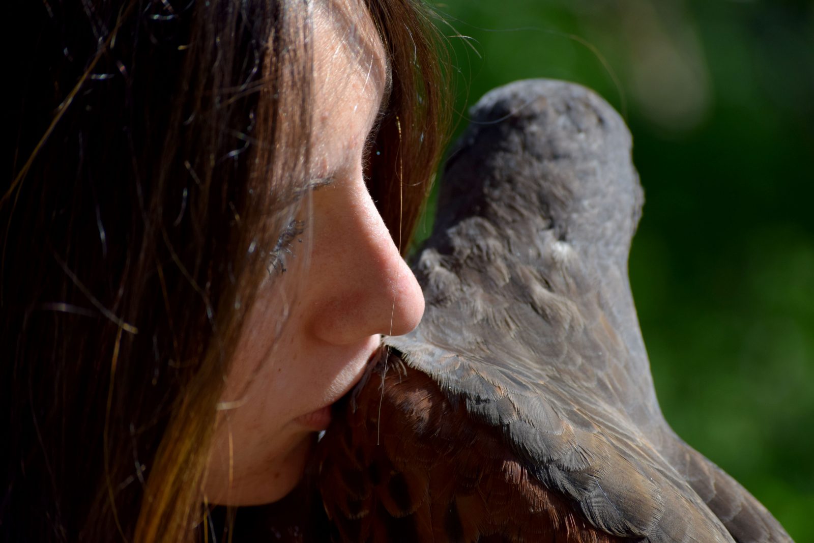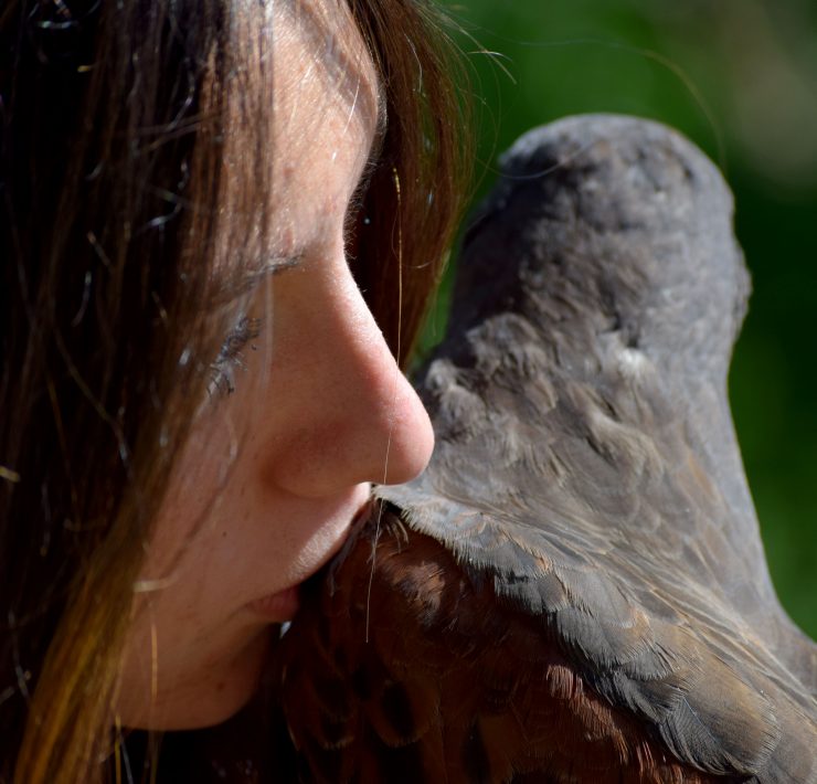 She rests her head on her falcon’s head, an embrace that not many would be willing to attempt.