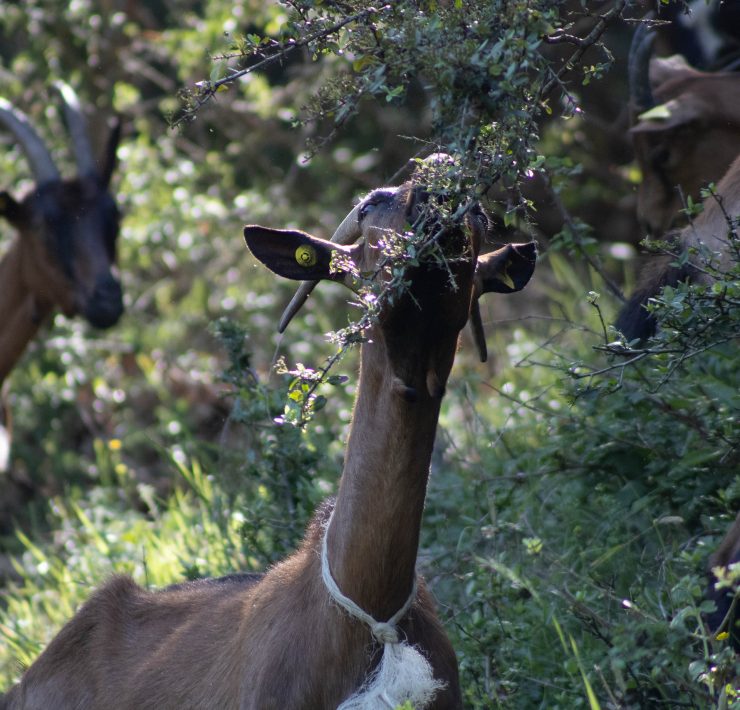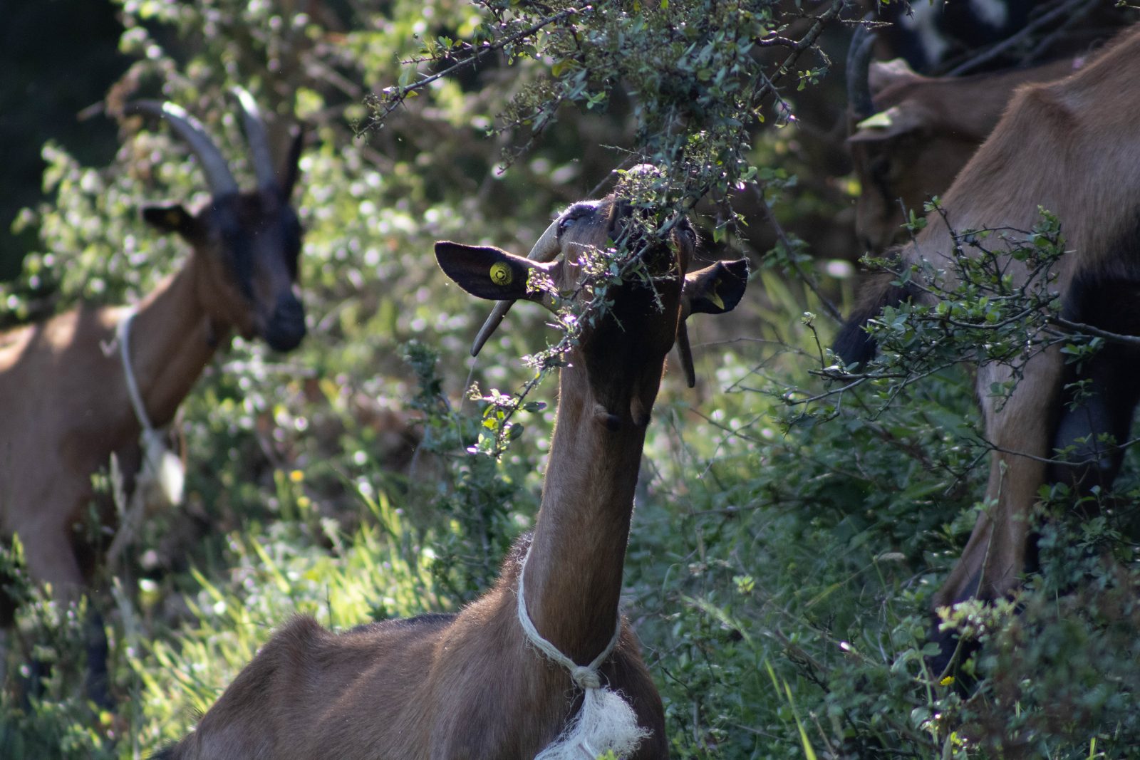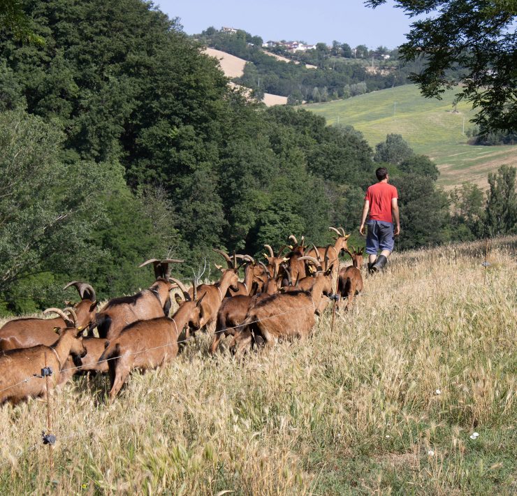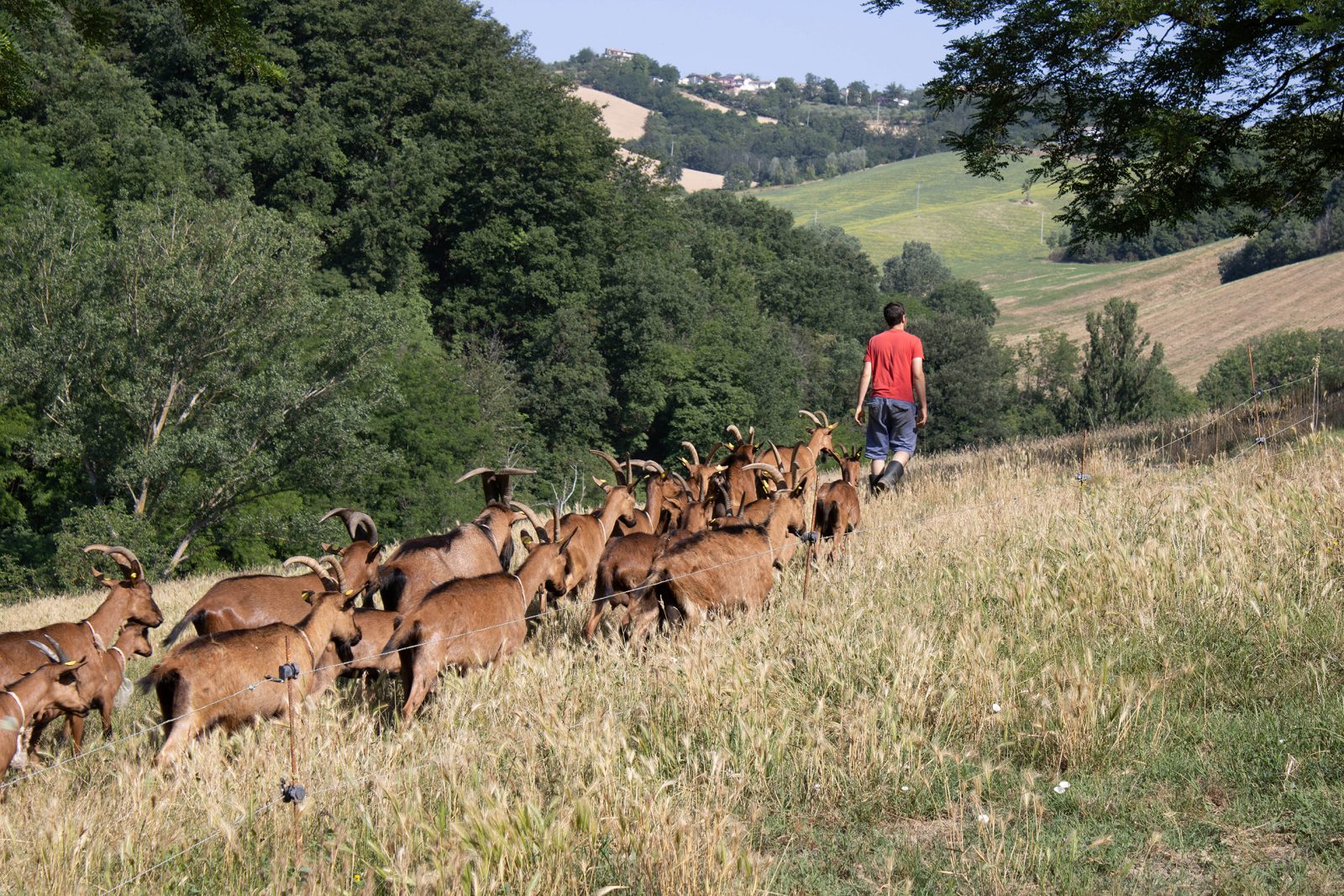 Organic farmer Michele Gili leads a herd of goats out to pasture at his farm, La Fattoria di Urs. He takes the goats and cows to alternating pastures every day after they have been milked, one of the many sustainable practices the farm has adopted to help manage resources and survive climate change.
