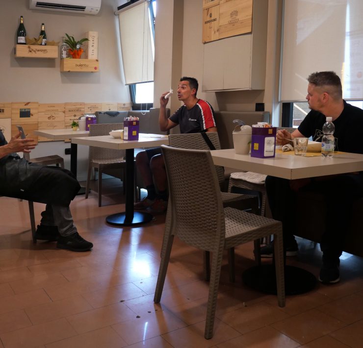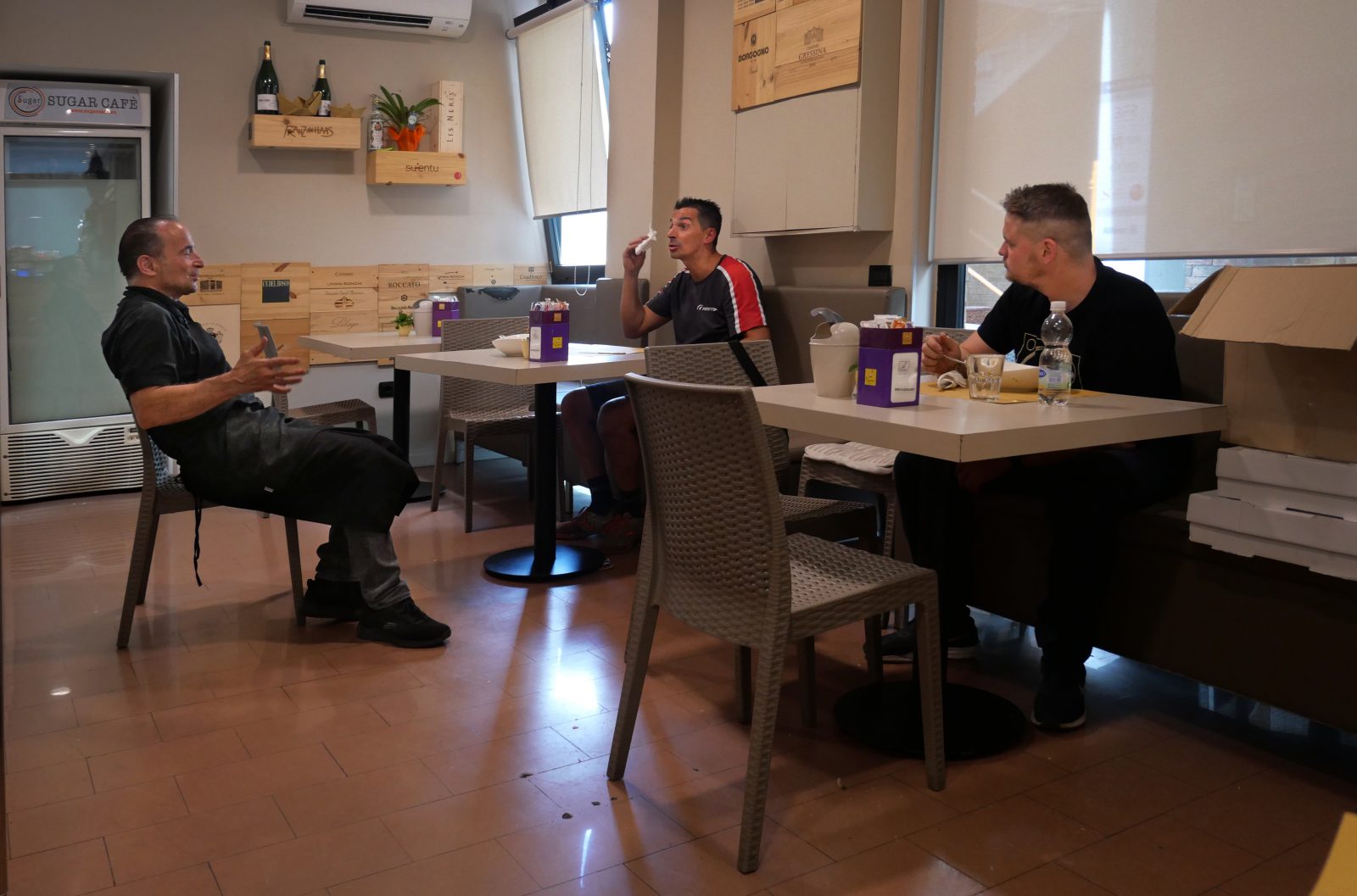 Giovanni Garbugli, the owner and operator of Sugar Cafe in Urbino, Italy takes a reprieve with some customers after bringing them a specialty pasta dish,. This chat has a sense of normalcy, something that was lost during the height of the pandemic when most of Garbugli’s business was done through delivery and car side pick-up.