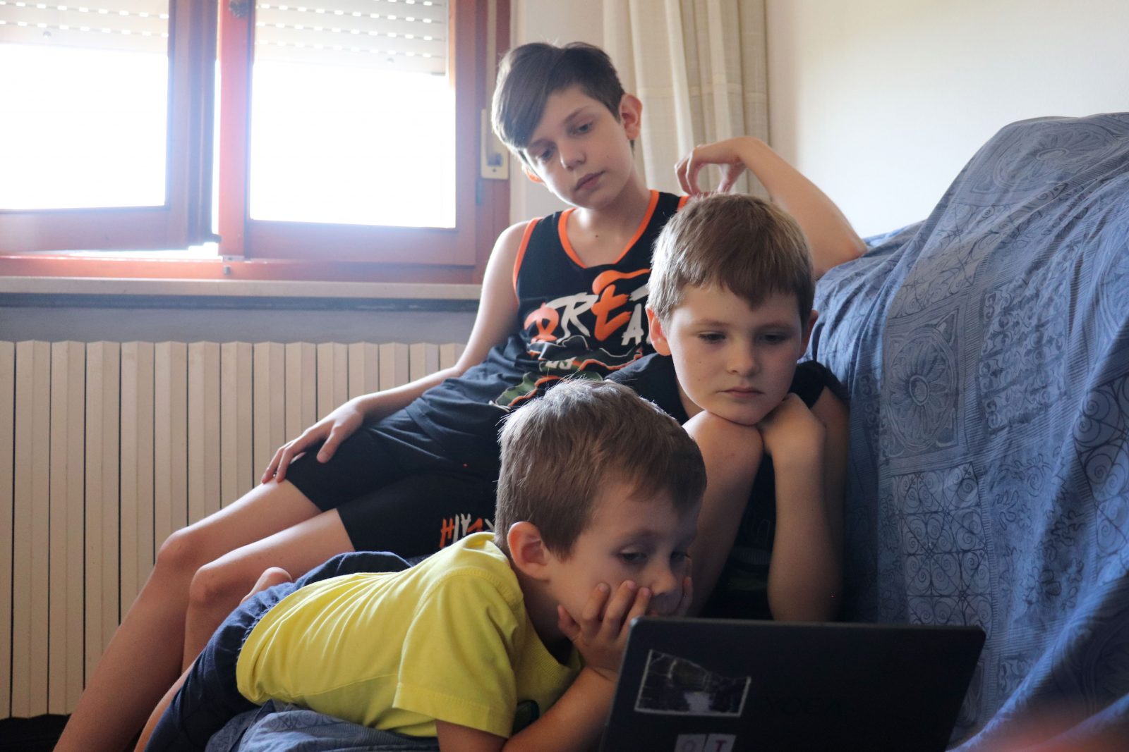 FERMIGNANO, Italy- Three young boys sit on a couch, eyes locked on their tablet, where the cartoon playing causes them to giggle.