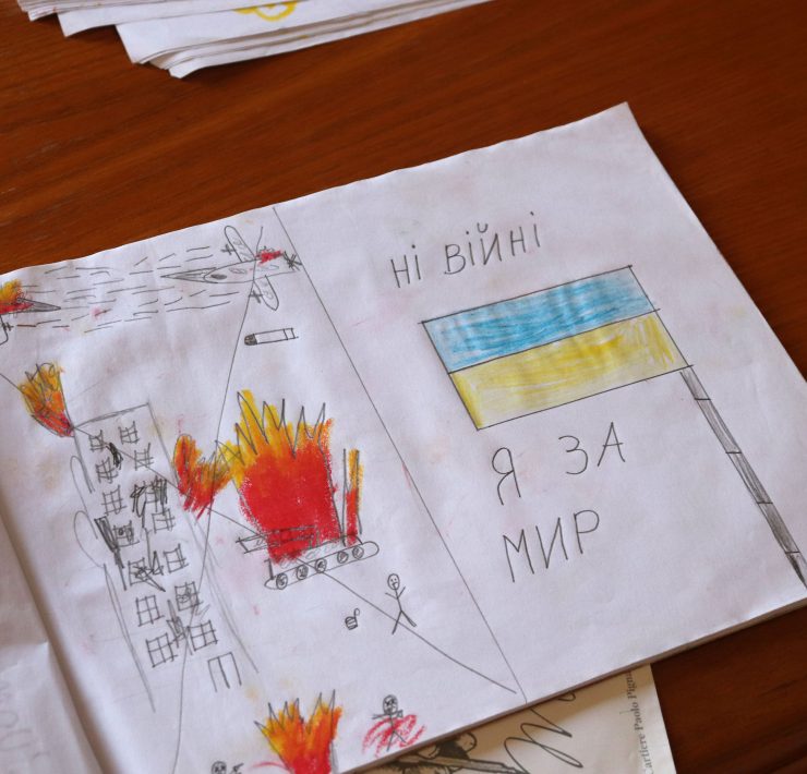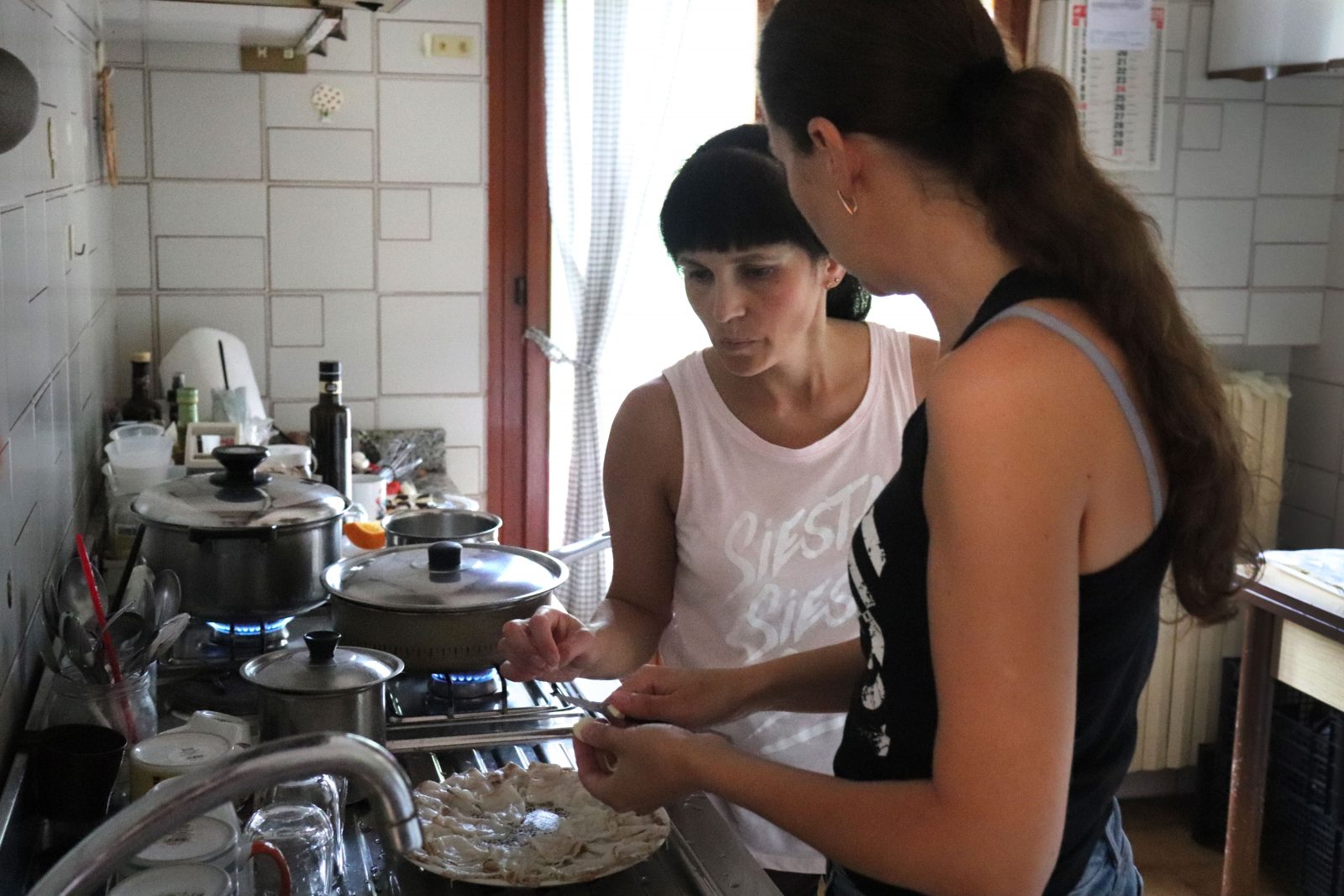 Now safe in Fermignano, the mothers prioritize providing their children with a sense of normalcy with books, art, toys, and games. They prepare traditional Ukrainian foods such as borscht (a stew-like dish with a beet base and vegetables, meat, and cream), salo (cold pork fat with garlic served on bread), and vareniki (potato dumplings eaten with oil, meat, and cream).